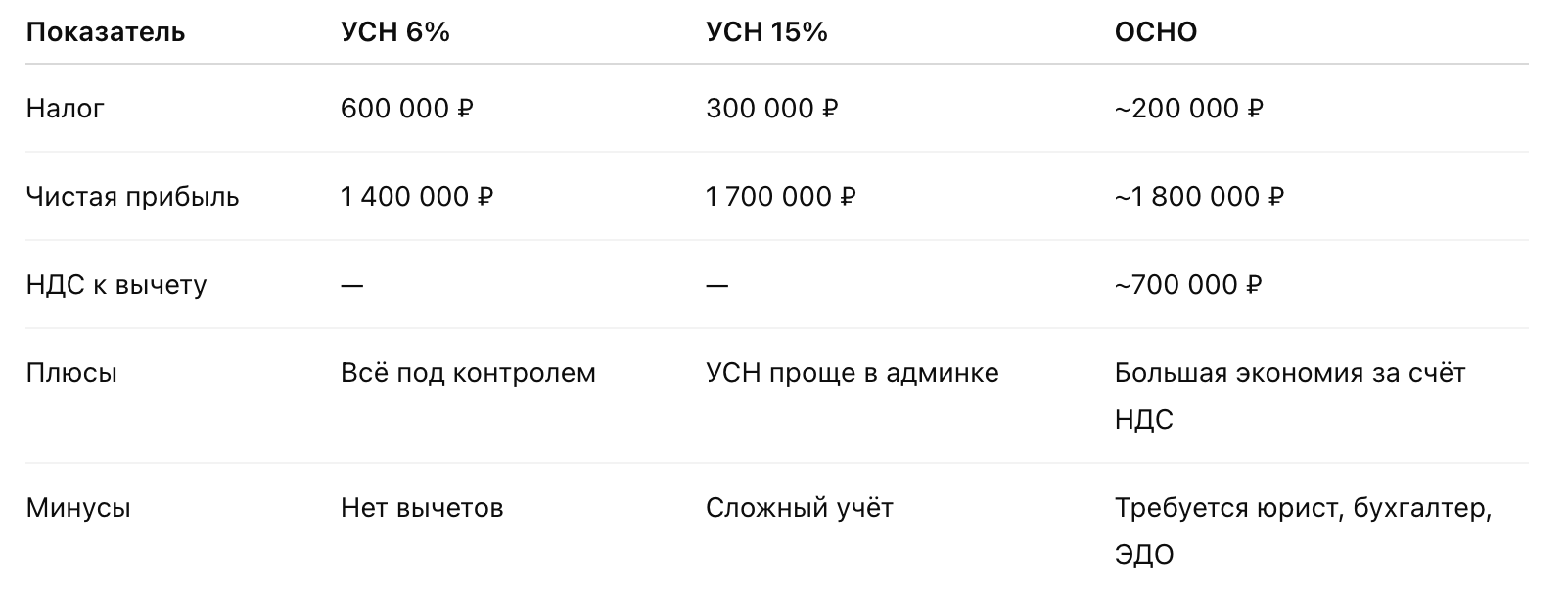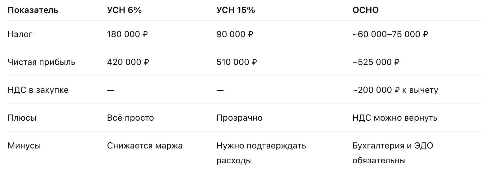 Вывод: На этом уровне УСН 15% — золотая середина. ОСНО пока не даёт ощутимого выигрыша.