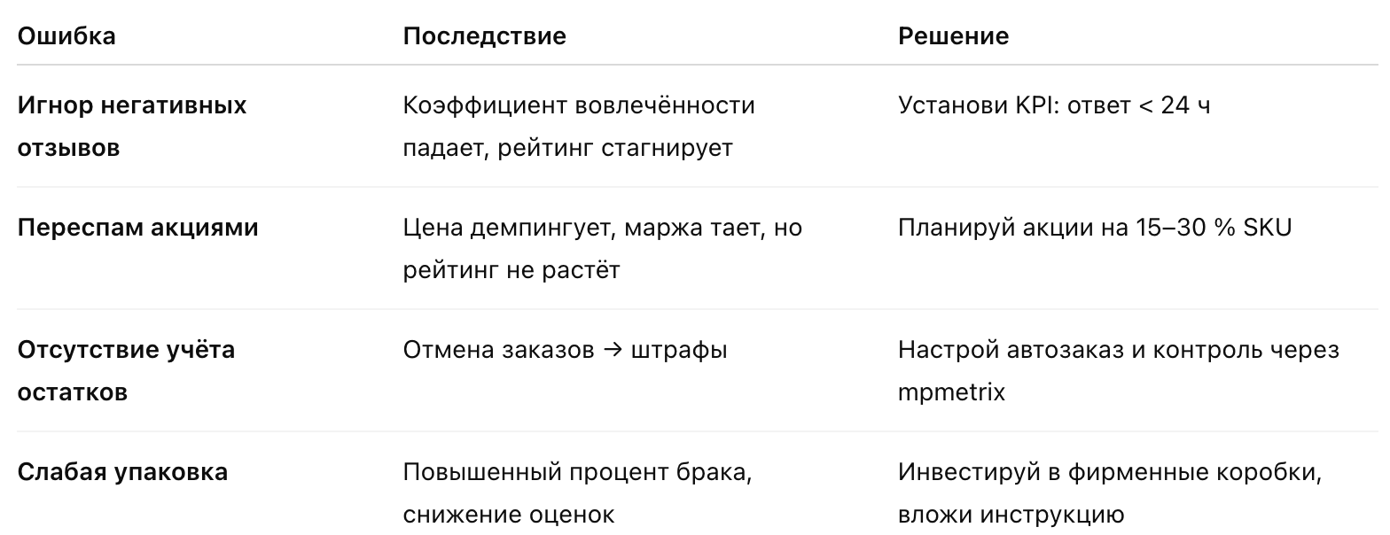 Основная причина снижения рейтинга — задержка поставок и отмены. По оферте продавец обязан отгрузить товар за ≤ 36 ч. Контролируй остатки, используй автоматические уведомления о low-stock.