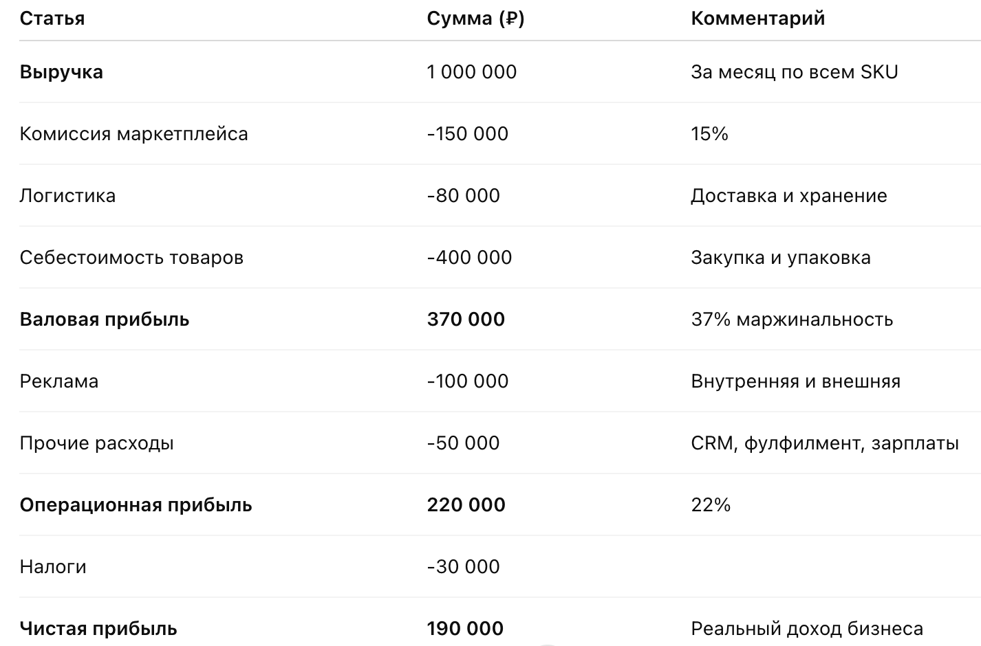 Важно: P&L не равен отчётам маркетплейса или бухгалтерии. Он нужен для управления бизнесом, а не для налоговой.