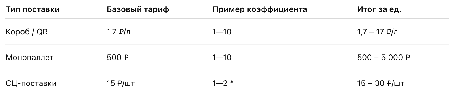 Стоимость = Базовый тариф × Коэффициент склада × Кол-во литров (или паллет)